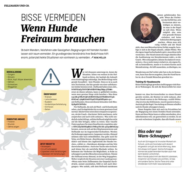 In diesem Artikel des beliebten Schweizer Tiermagazins „TierWelt“, der Aufgrund eines Interviews mit Oliver Weber entstanden ist, werden einige solche Situationen beschrieben und wichtige Hundesignale aufgezeigt.